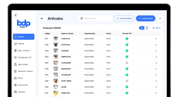 El TPV gestiona el día a día de tu negocio, mientras que Dataset centraliza artículos, precios y usuarios con sincronización en tiempo real. Todo conectado, todo actualizado, sin duplicar tareas.